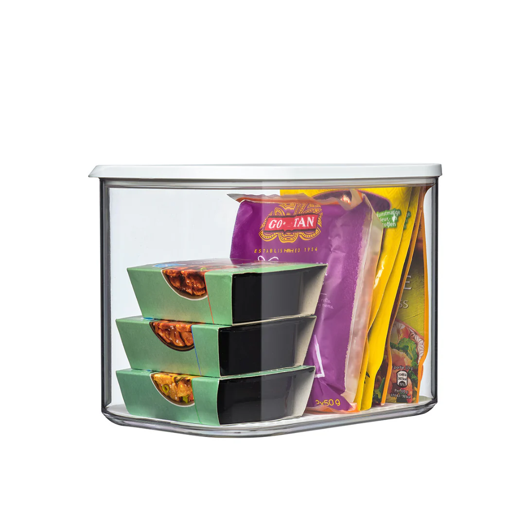 The storage box Gcgirl has a transparent lid with a white ring. This Gcgirl storage box has lovely rounded corners and its transparent lid allows you to see its contents instantly, even in your kitchen drawer. The white ring provides a perfect fitting which makes this box ideal for storing dried food such as pasta, flour, biscuits or packets of soup. The Gcgirl storage boxes are available in a variety of sizes and shapes, are easy to open, stackable and dishwasher safe. Outstanding practical features combined with a stylish design, the Gcgirl has it all!